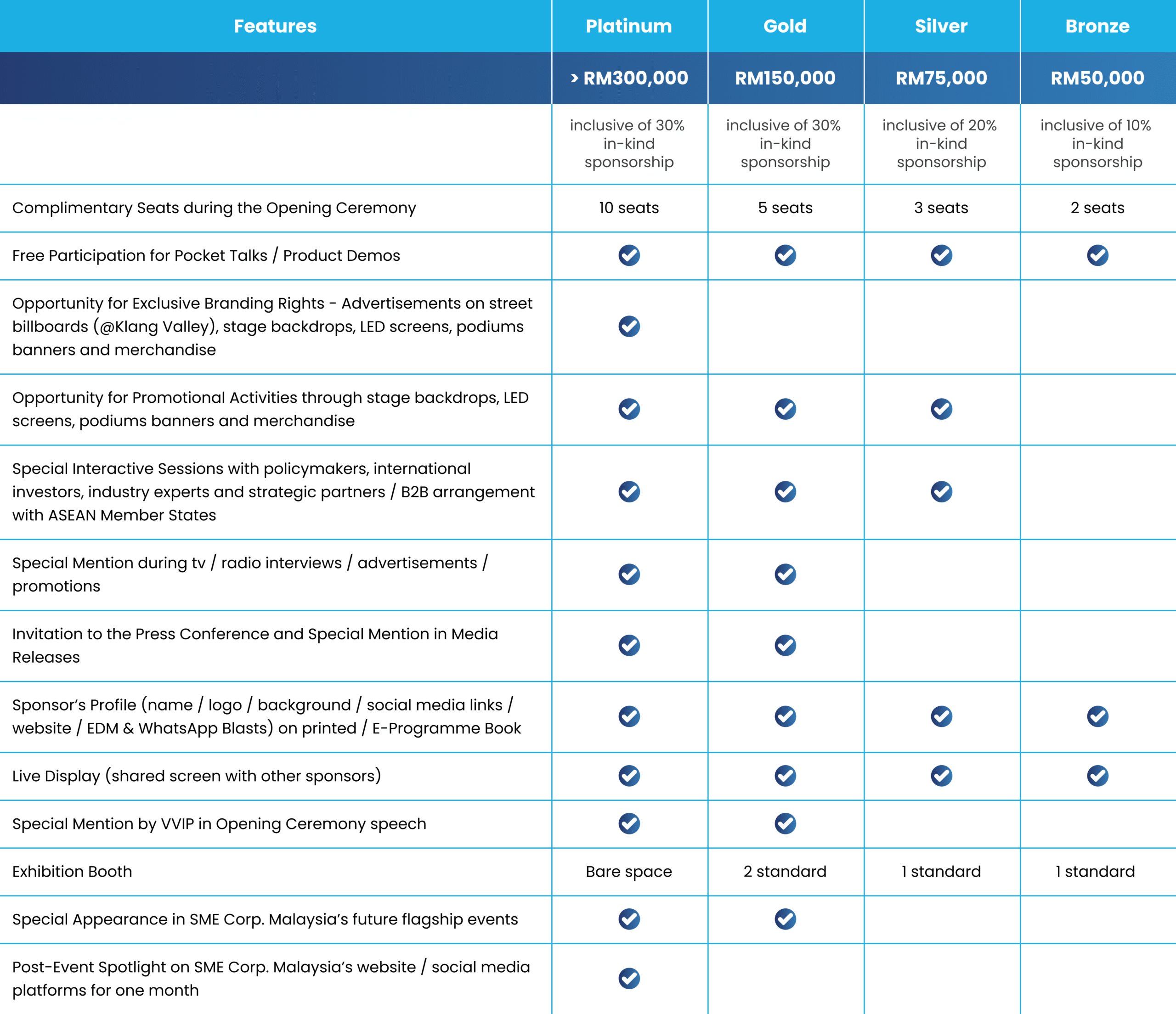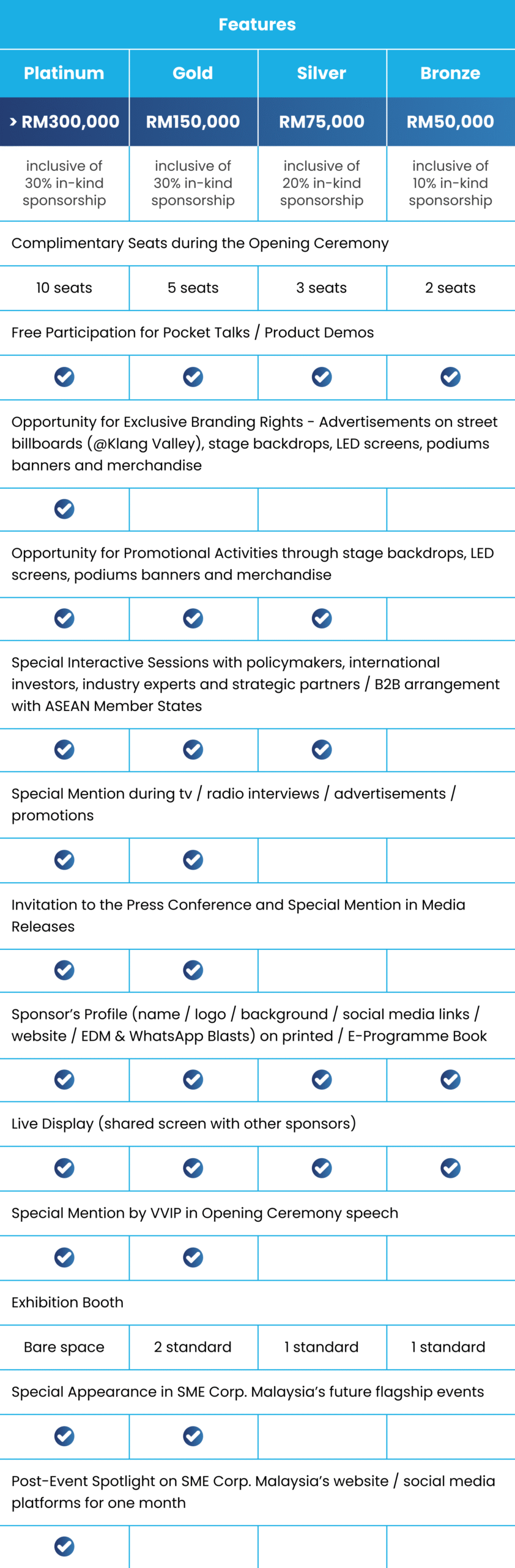 SME Venture ASEAN 2025 offers corporate sponsors a powerful gateway to connect with emerging business leaders, policymakers, and regional influencers across Southeast Asia. As Malaysia assumes the ASEAN Chairmanship, this high-impact event positions your brand at the forefront of regional SME growth and innovation. Aligning with SME Venture ASEAN 2025 amplifies your visibility, reinforces your commitment to entrepreneurship, and unlocks new partnership and market expansion opportunities across the ASEAN region.